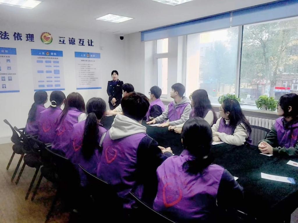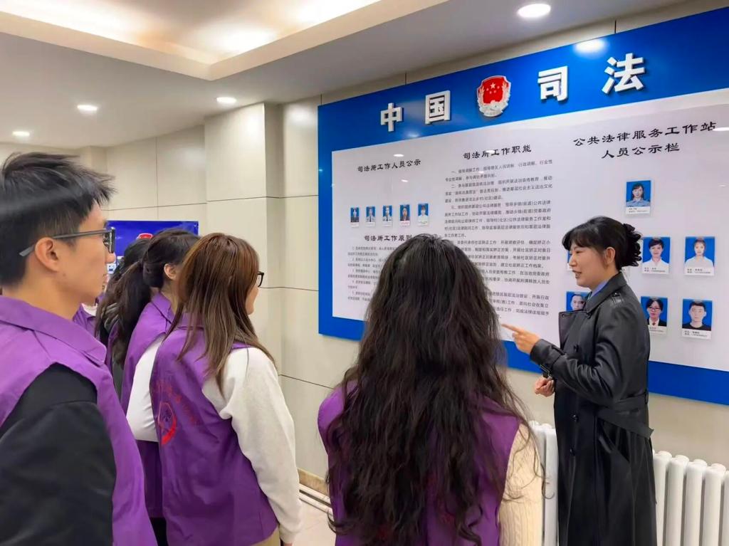 青年志愿者协会组织同学们走进黑龙江省哈尔滨市道外区司法局大有坊司法所开展参观学习。本次活动由司法所所长杨璐主持,副所长王品、哈尔滨市司法局矫正支队二大队队长杨宇先后讲解,人民调解员全程协助。