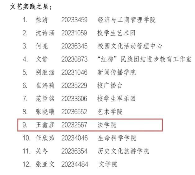 2023级法学4班学生,现任班级文体委员,曾任校学生艺术团听雪合唱团副团长。累计获得各类奖项11项。