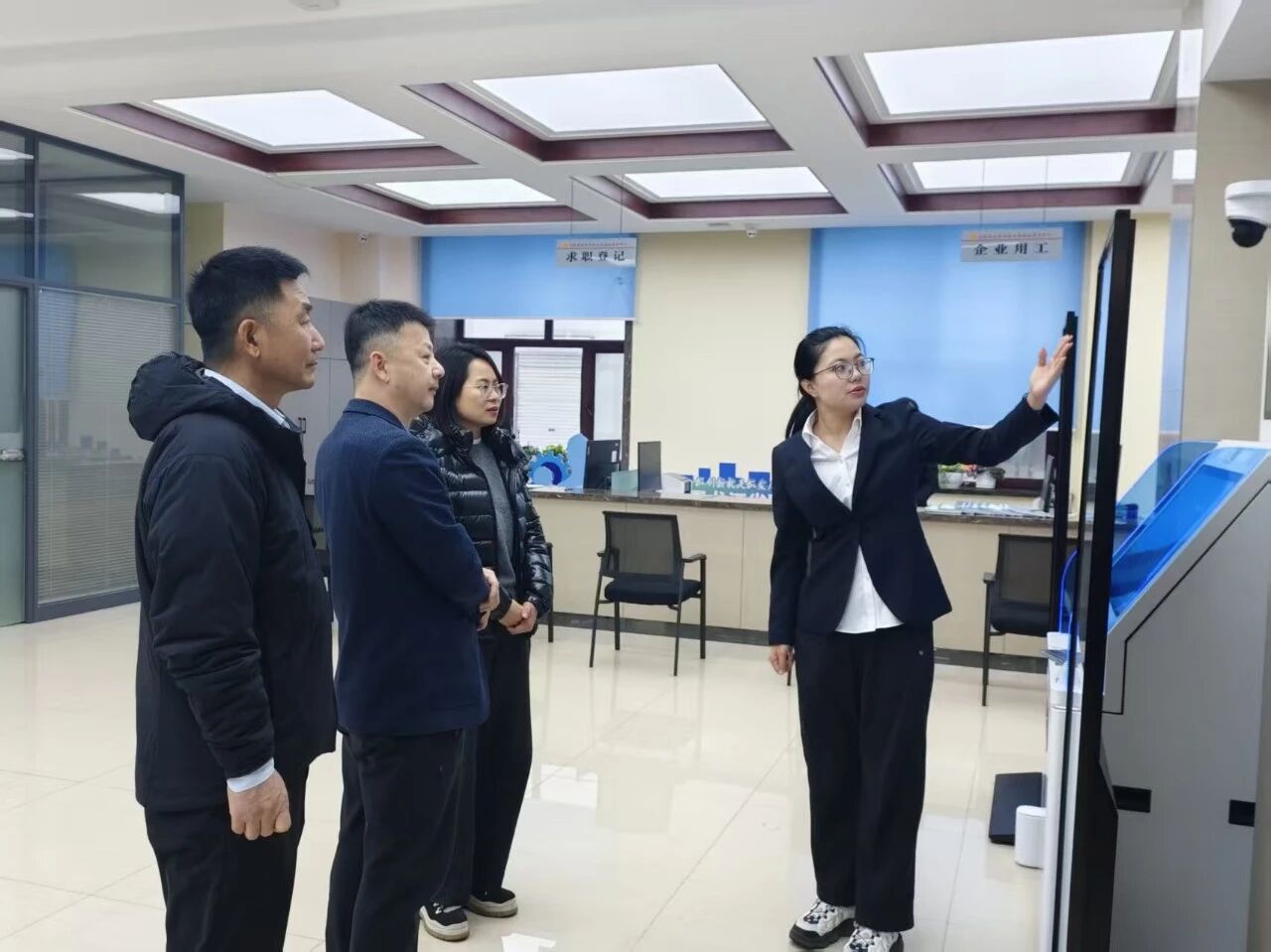 一行还参观了智慧岗位库,以及求职登记、企业用工、技能培训、困难帮扶四个工作窗口。