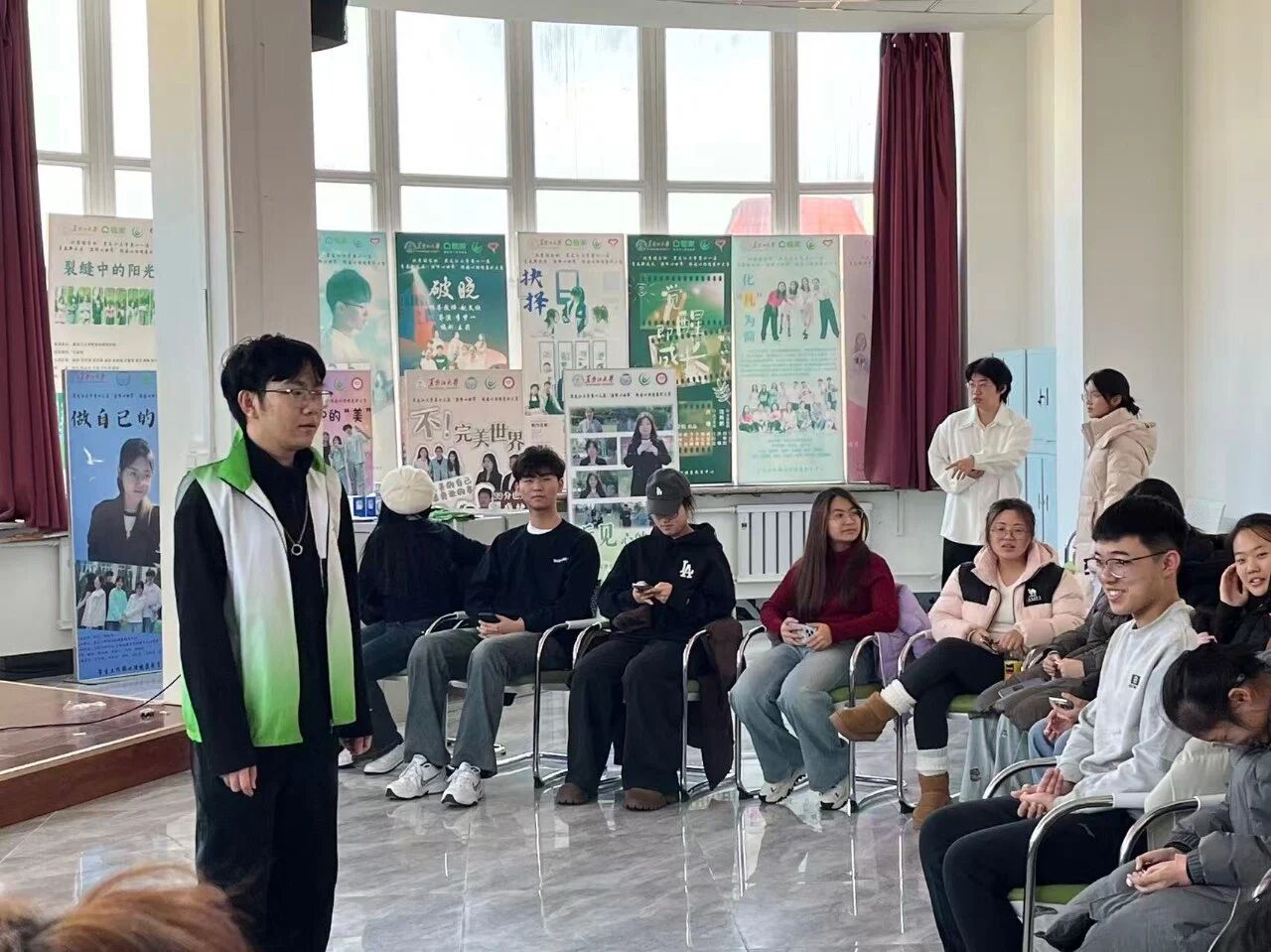 活动启动环节,主持人用 “反向问答” “即兴接龙” 和“萝卜蹲”三个互动小游戏快速调动起现场氛围,同学们踊跃参与互动、顺利破冰,通过相互交流加深了彼此的初步认知。现场掌声与欢笑交织,氛围热烈融洽,原本互不熟悉的同学们在趣味互动中慢慢消除隔阂,不仅为后续环节铺垫了顺畅的沟通基础,也充分激发了大家参与和分享的热情。