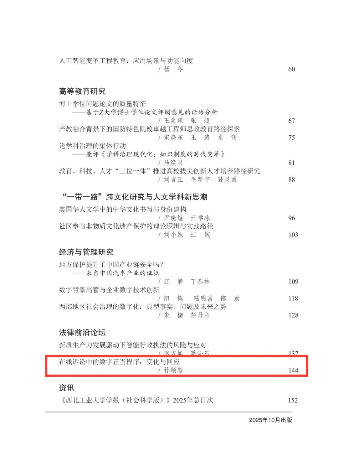 我院教师朴顺善发表论文《在线诉讼中的数字正当程序:变化与回应》于《西北工业大学学报社会科学版》2025年第4期。