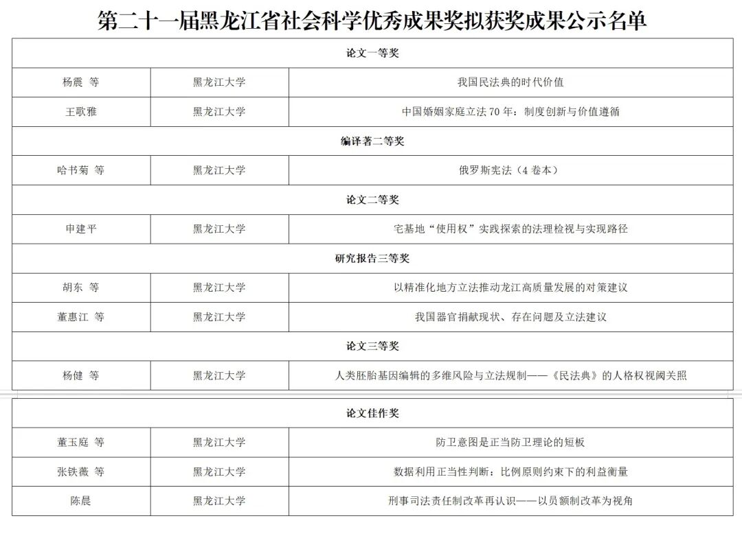 黑龙江省社会科学优秀成果奖是省委、省政府批准设立的全省社会科学研究领域的最高奖项,每3年评选1次,旨在表彰和奖励对推动理论创新、服务社会发展、弘扬先进文化具有重要价值的优秀研究成果。我院教师取得本次优异成绩凝聚着老师们长期以来坚守学术方向、深耕科研沃土的不懈努力,彰显了学院在法学研究中的深厚积淀与创新活力。